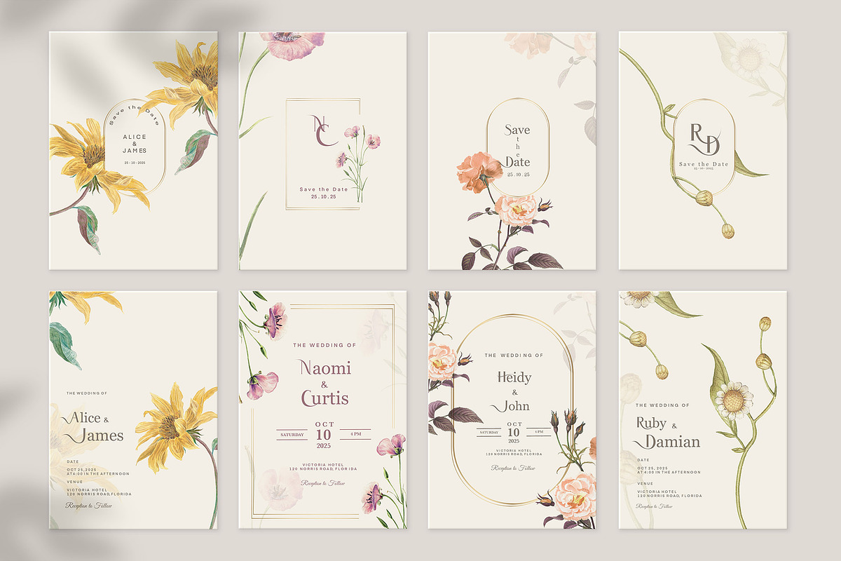 • 48 Wedding Cards from Vol I, II and III (24 Invitation & 24 Save the Date) in PSD formats.
