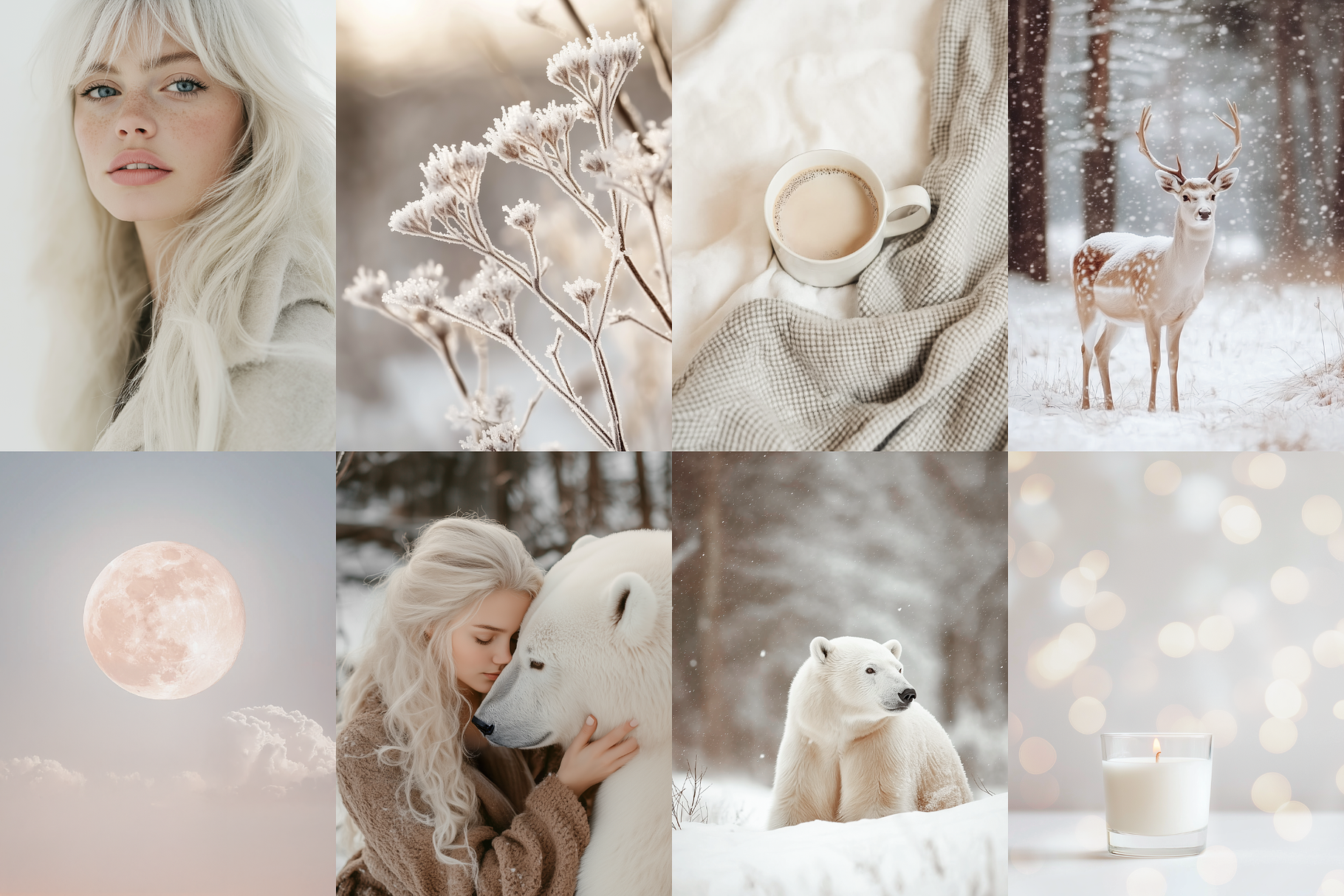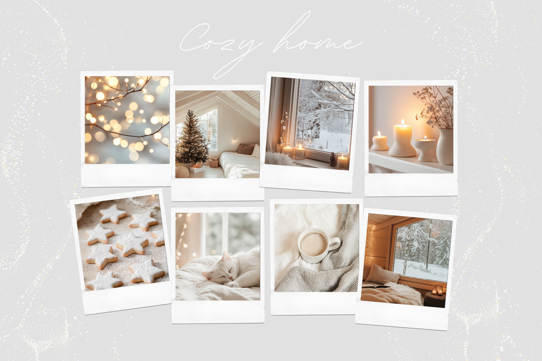 The mood of Christmas and Happy New Year holidays. Magical, cozy, airy, cold outside, but warm inside. Snowy white and beige minimalistic lifestyle photos of: nature landscapes, beautiful women (faceless and face), villages, trains, and views from train windows, pets, wild animals, birds, cozy home moments, warm landscapes, still life, interiors, winter textures, and more.